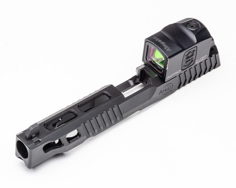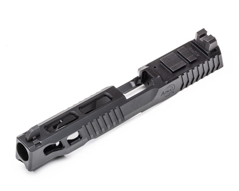 - The slide ships with suppressor-height black-on-black sights installed by Apex. These co-witness with your mounted red dot, giving you a backup sight picture without removing the optic.