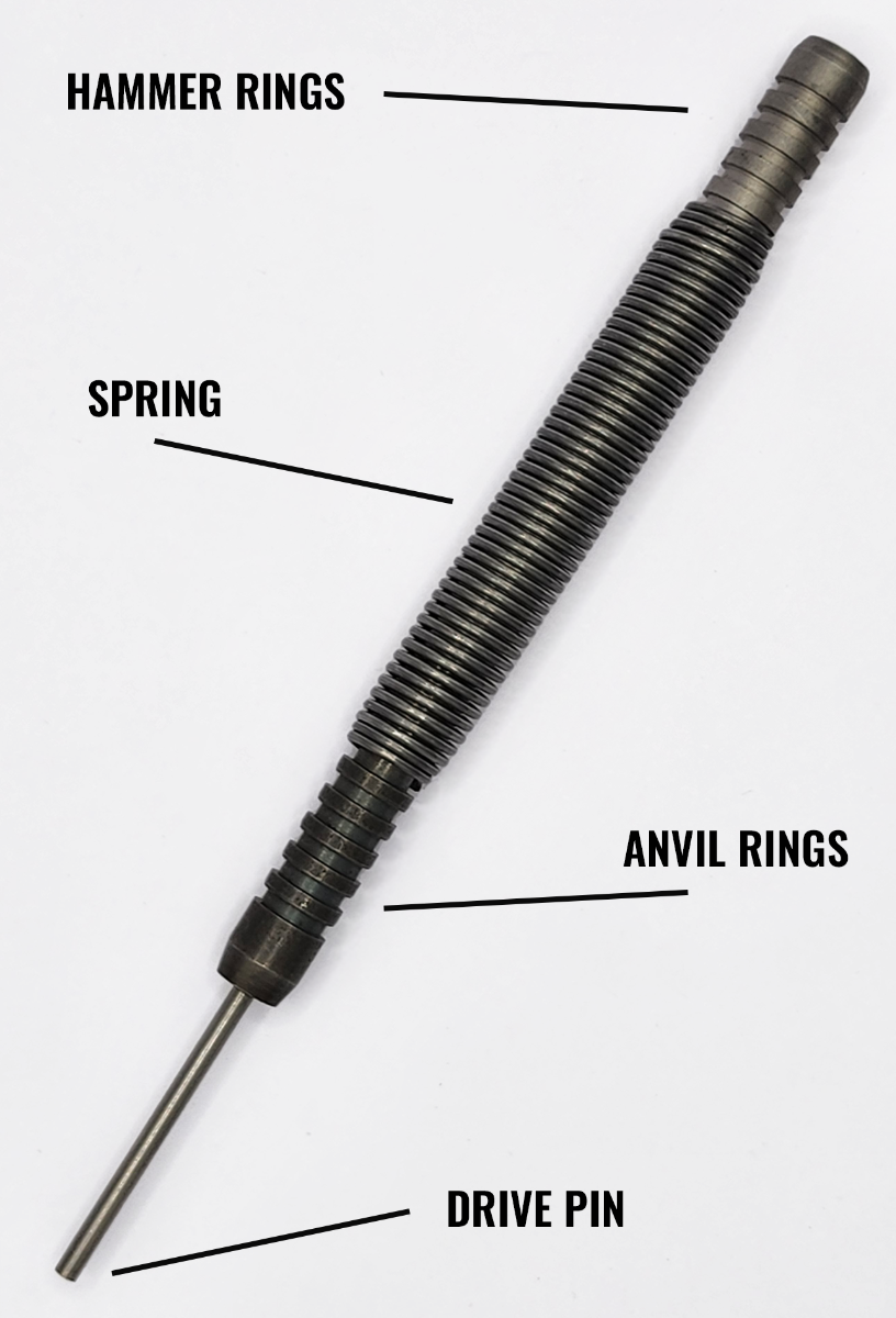 - Construction: Spring-powered drive pin with anvil and hammer rings