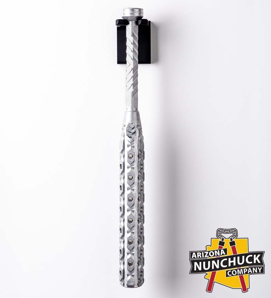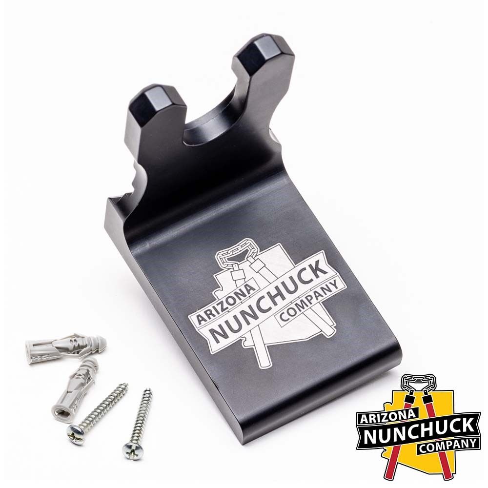Built from a single piece of machined aluminum, the Mr. Wall Mount is tough enough for daily use. The black anodized finish resists scratches and corrosion, so it holds up in a garage, workshop, man cave, or gun room. It mounts flush to your wall with hidden screw pockets—all hardware is included, so you won’t need a trip to the hardware store. Just find a stud, drill a couple of holes, and you’re set. The mount works with most AZ Nunchuck Co. items, including candlesticks, spike mauls, flails, and muffler bearings. If you own any of these, this mount fits them naturally.