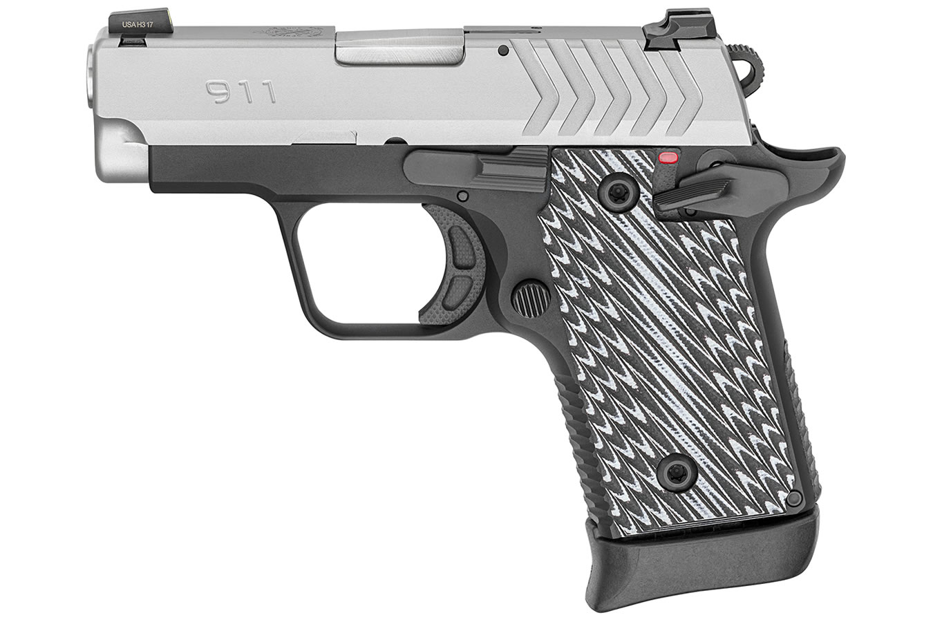 - Frame material: stainless steel; slide material: stainless steel with a brushed finish; grip texture: aggressive stippling on frontstrap and backstrap