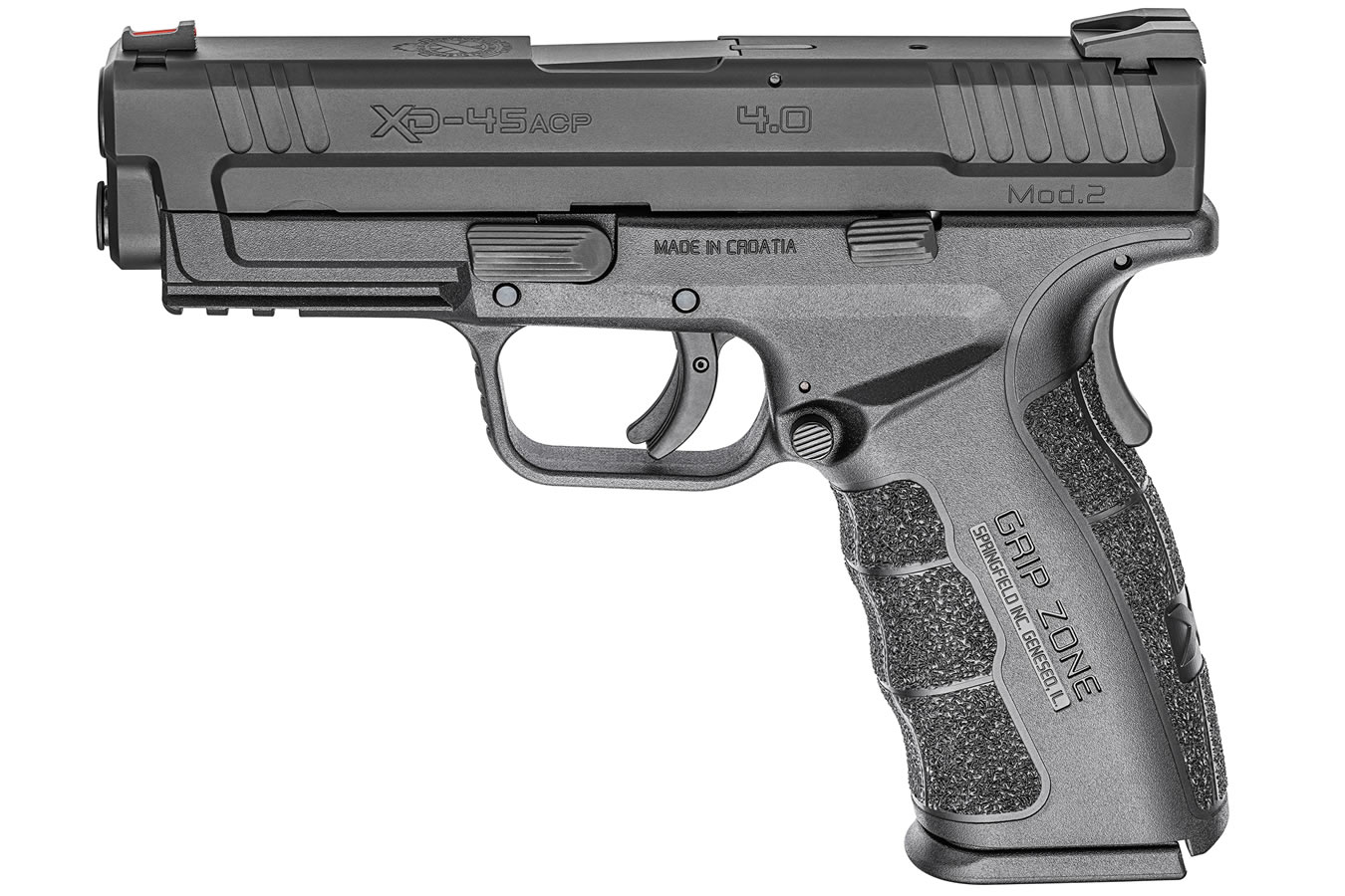 This is the Springfield XD Mod.2 in .45 ACP, the 4.0 Service Model, finished in black and bundled as the Holiday Package with the GripZone frame texture. It is a striker-fired, semi-automatic pistol designed for personal defense and range use. The “Mod.2” designation brings improvements over the original XD line, including a more refined grip angle and the aggressive, textured GripZone that locks your hand into place. The Holiday Package typically includes two extra magazines and a padded nylon holster, giving you more value upfront. This is a proven platform from Springfield Armory that has been on the market for years, trusted by shooters who want a reliable .45 without the bulk of a full-size 5-inch barrel. The 4-inch barrel is a sweet spot for balancing ballistics and everyday carry comfort.